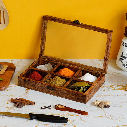 Brown 6 Compartments Rectangle Handcrafted Wooden Spice Box