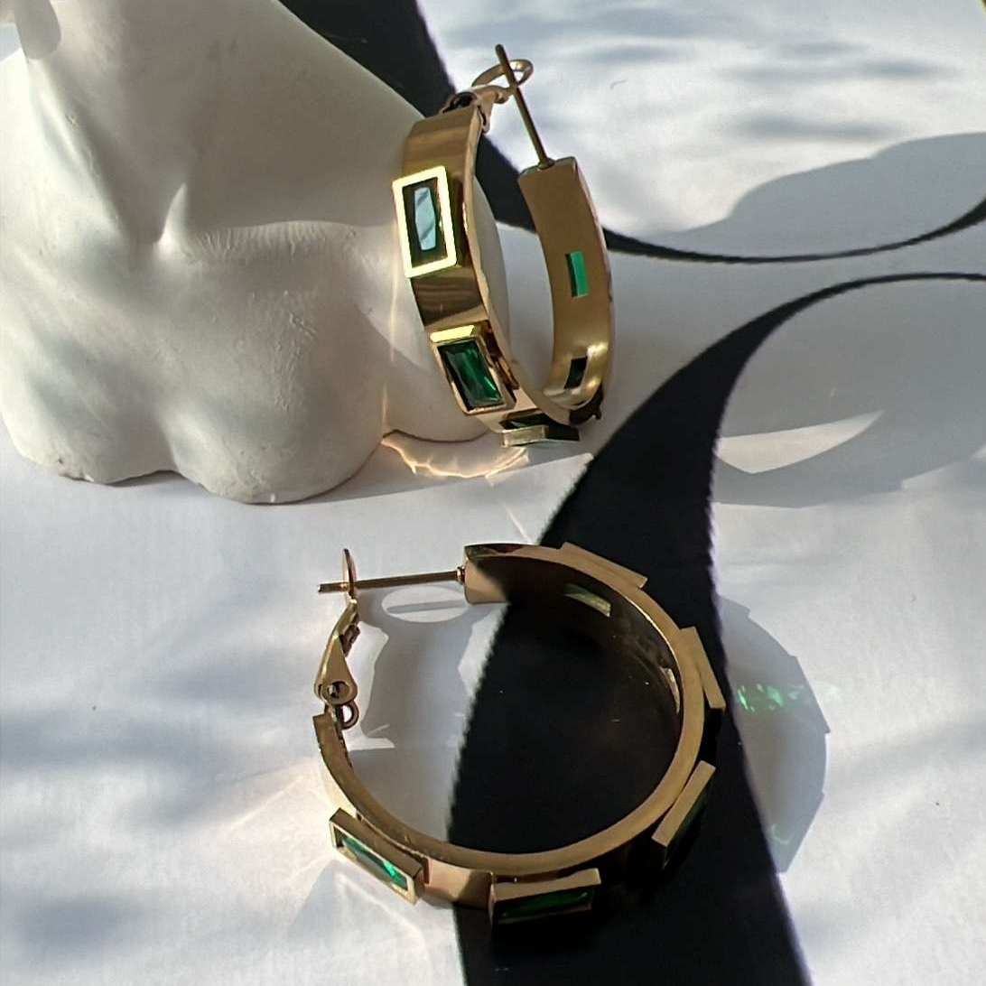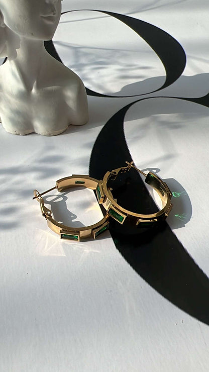 Add a touch of elegance to your outfit with our Ashlyn hoops. These stainless steel, gold plated hoops feature emerald green zircons and measure 3cms. The anti-tarnish and waterproof properties make them a durable and stunning addition to your jewelry collection. Elevate your style with these hoops today!
