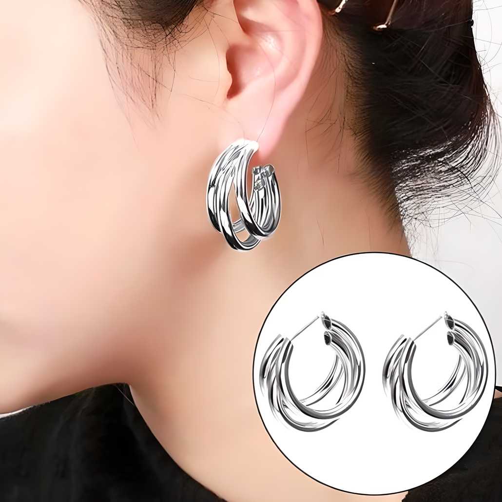 Product Name: AVR JEWELS Silver plated korean Trihoop Earrings For Women and Girls Package Contains: It has 1 Pair of Earrings Material: Alloy Color: Multicolor Work: Gold & Silver Plated Occasion: Western Combo: Pack of 1 Ideal for: Women Weight: 100