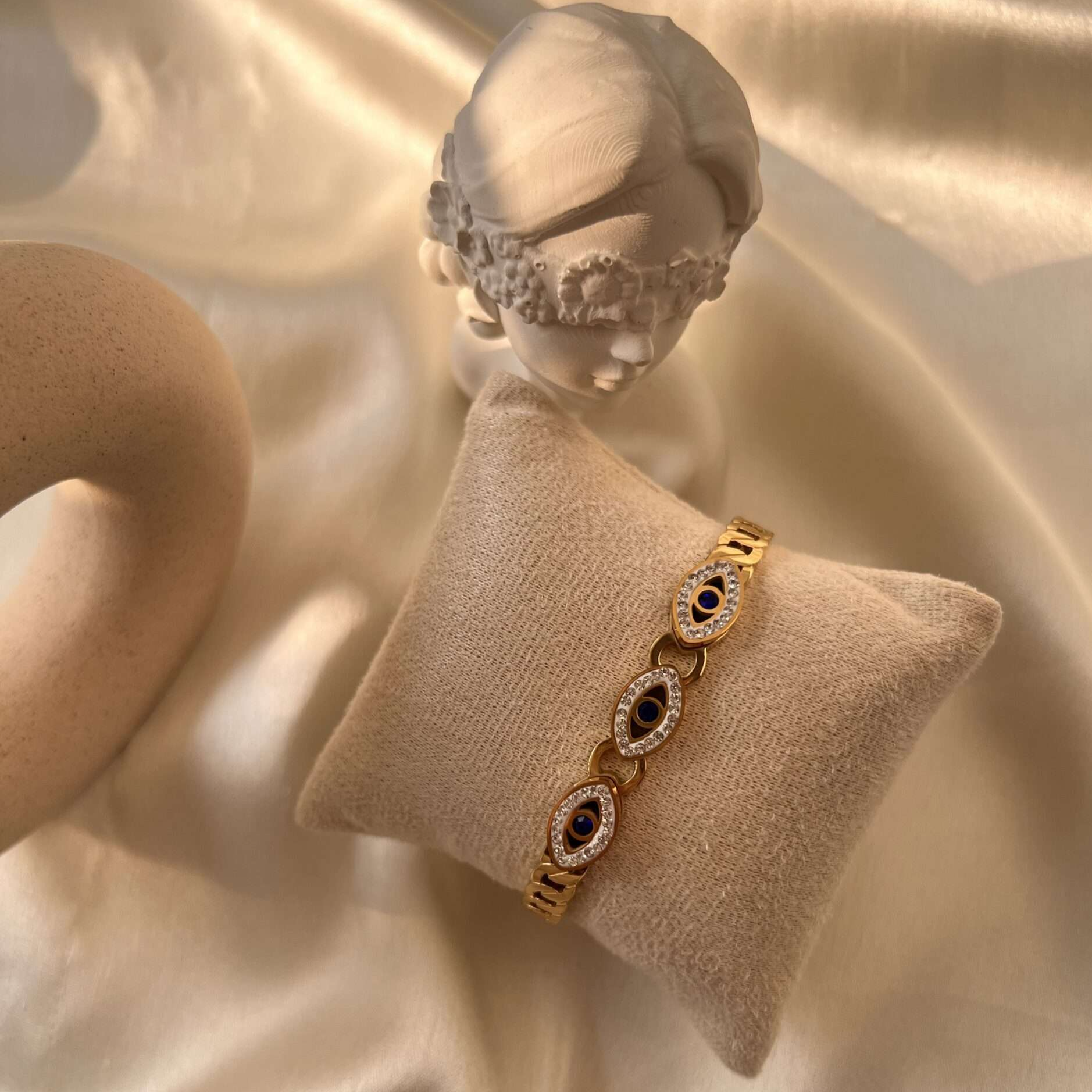 Experience ultimate protection and style with the Bisou evil eye bangle. This gold plated titanium steel bangle features stunning zirconia stones, creating a universal size and anti-tarnish design. Its openable feature adds convenience, while its non-corrosive and waterproof qualities ensure long-lasting wear. Find peace and beauty in one with this must-have accessory.