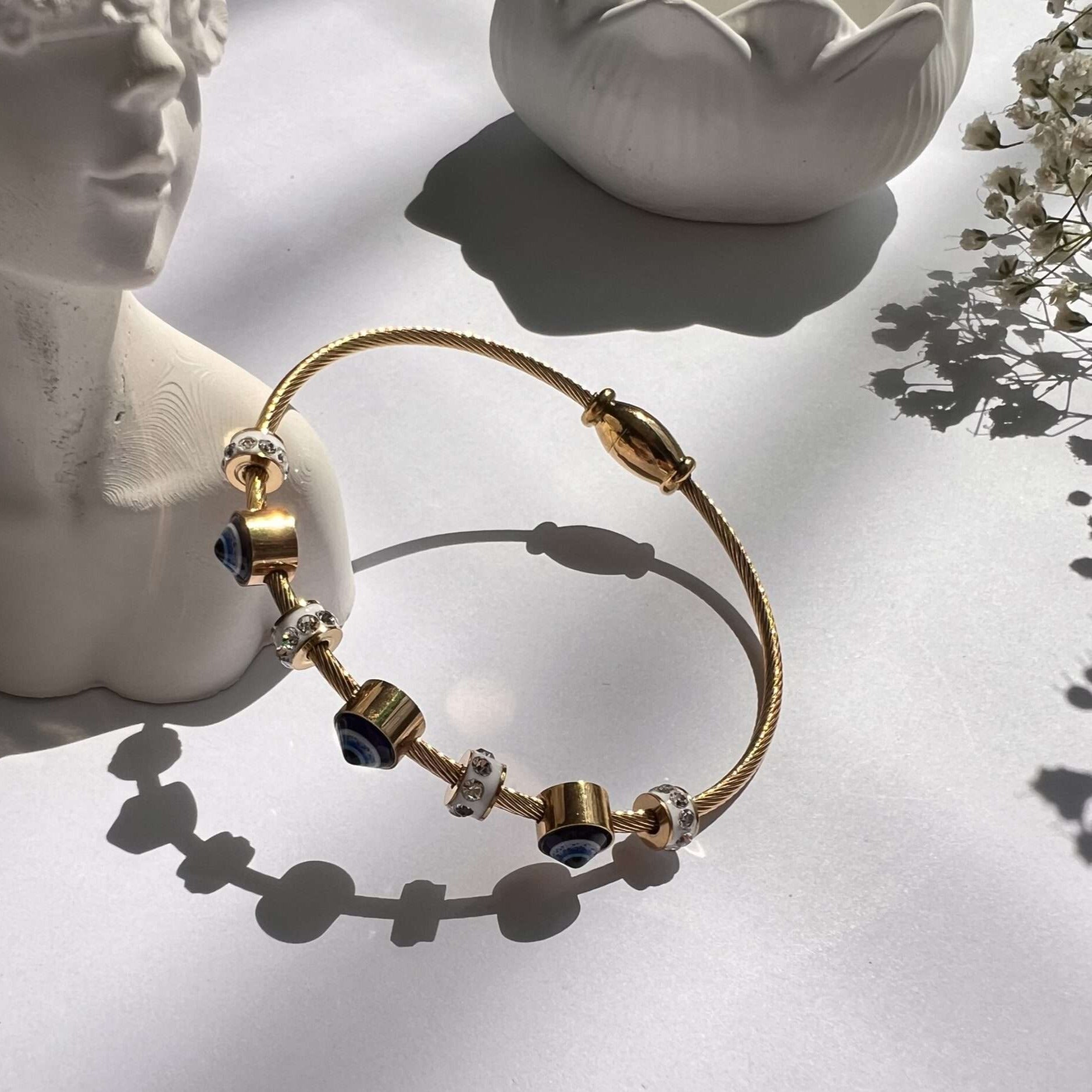 Embrace your inner bohemian spirit with our gold plated, anti-tarnish and waterproof evil eye bangle. The universal size and magnetic lock make it easy to wear alone or mix and match with other bracelets to create your own unique style. Protect yourself from negative energies while adding a touch of style to your look.