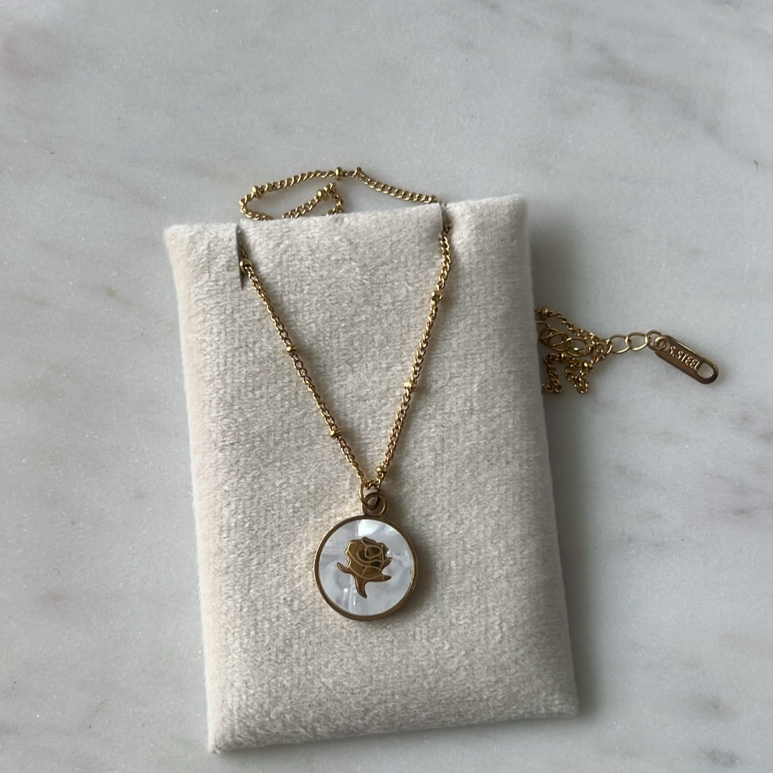 Indulge in the simplicity and elegance of our Brix rose neckpiece. The minimal rose on a white shell pendant, crafted in stainless steel and gold plating, radiates beauty. Its anti-tarnish, non-corrosive, and waterproof properties make it a lasting addition to your wardrobe. Adjustable from 16 inches with an extension for the perfect fit.
