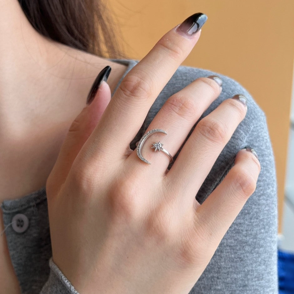 A lightweight ring with a sterling silver finish featuring a crescent moon and star shape with a center opening, giving the ring a unique craftsmanship and style.
