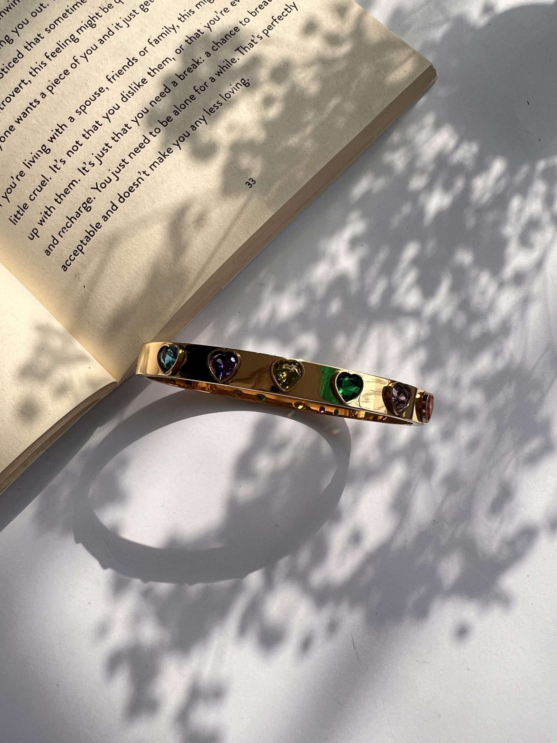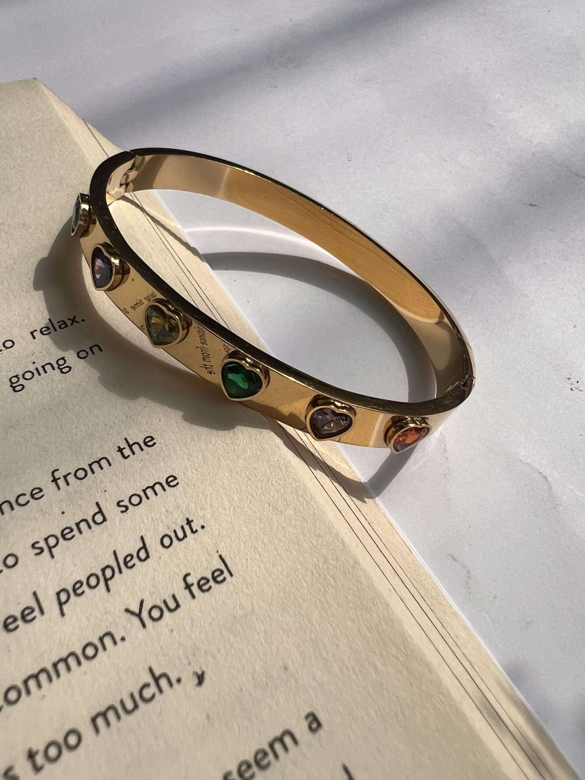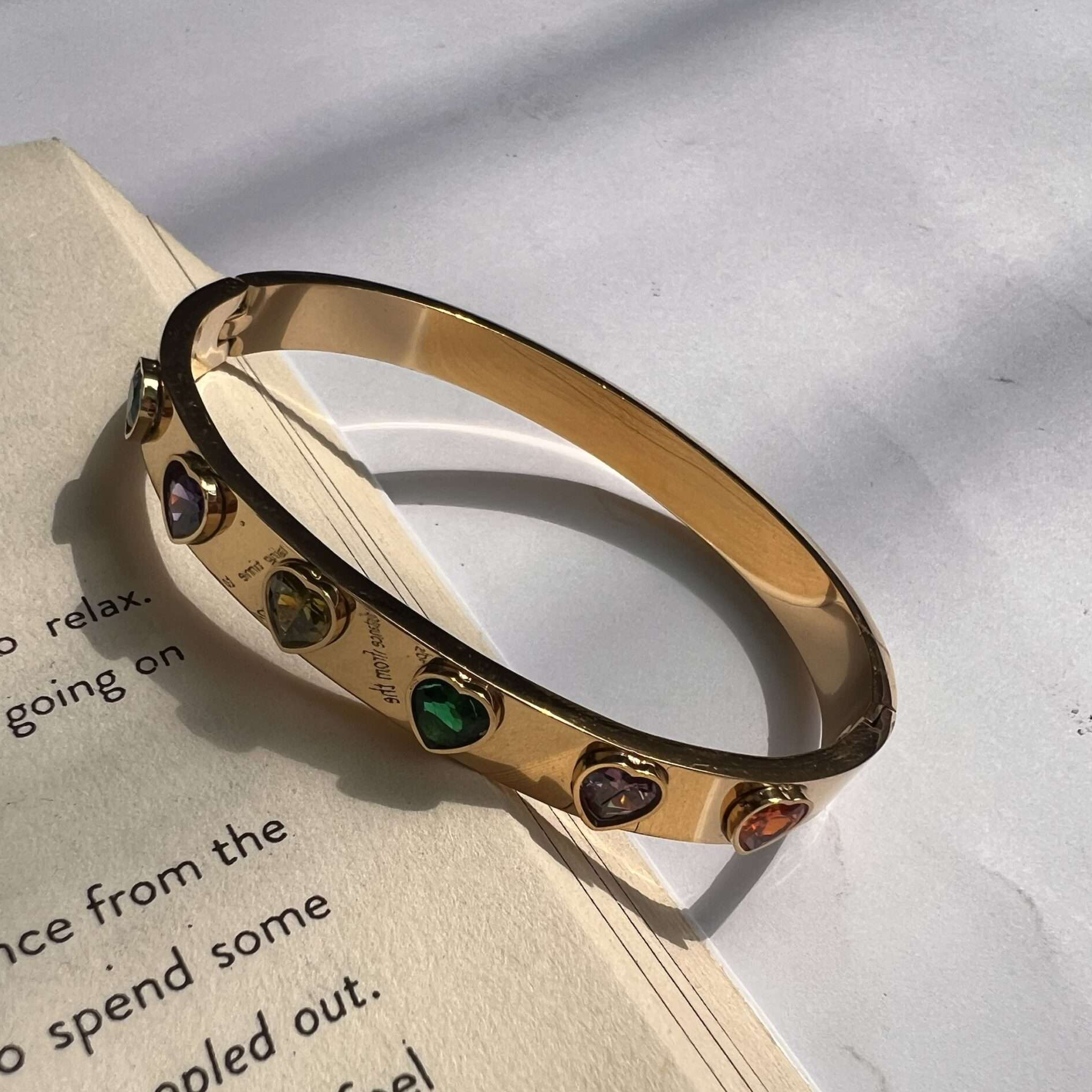 This dappled heart bangle is a must-have for jewelry lovers! Featuring heart-shaped stones in various vibrant colors on a gold-plated, openable bangle that fits all sizes. It is anti-tarnish, non-corrosive, and waterproof, making it both stylish and durable. Add a splash of color to your outfit and let your heart shine!