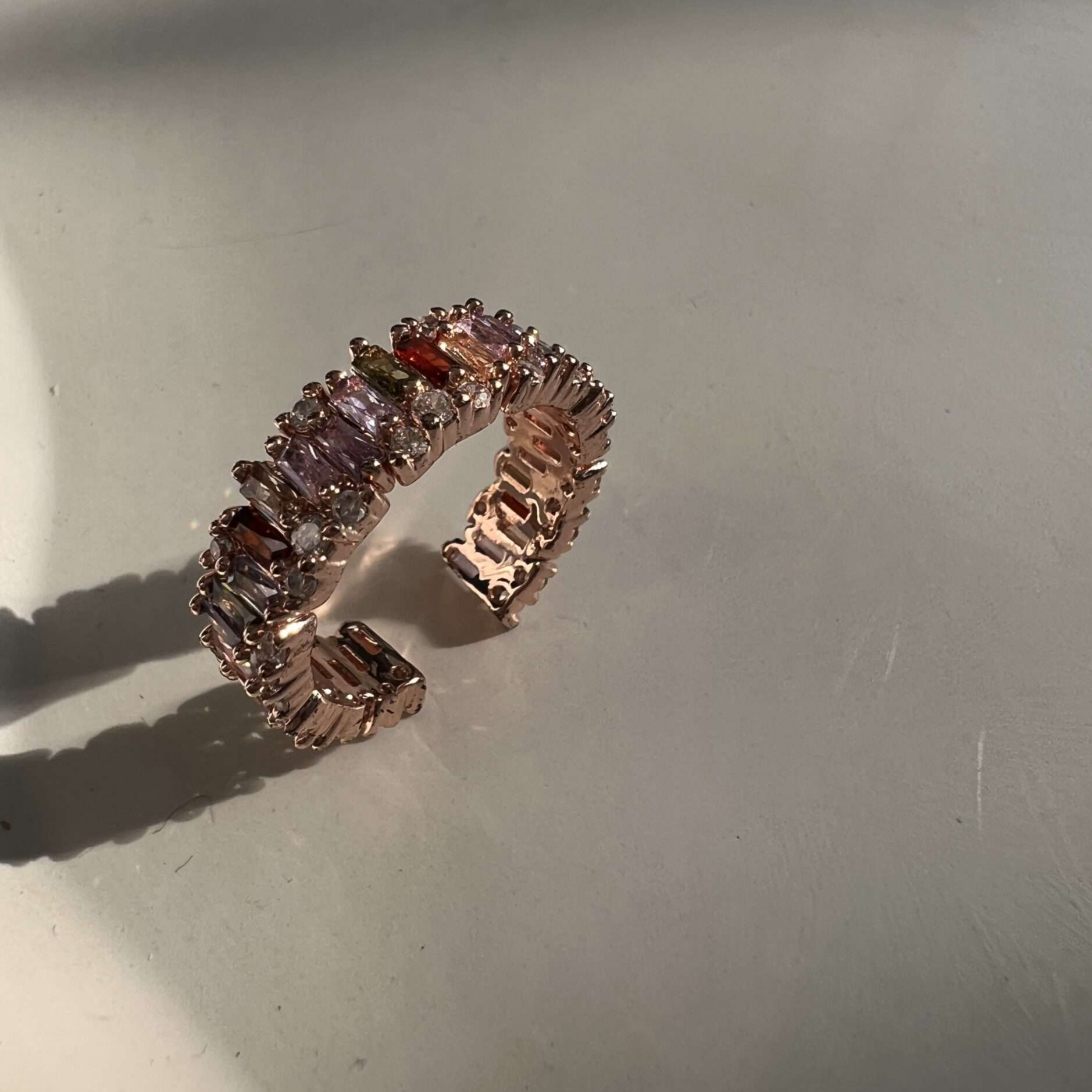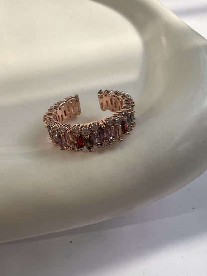 Introducing the Dove Rainbow Ring, a best seller! This baguette ring features a band of multicoloured stones with pretty zirconia, adjustable for the perfect fit. Its anti-tarnish, non-corrosive, and waterproof properties ensure long-lasting beauty. Add a pop of color to any outfit with this stunning ring!