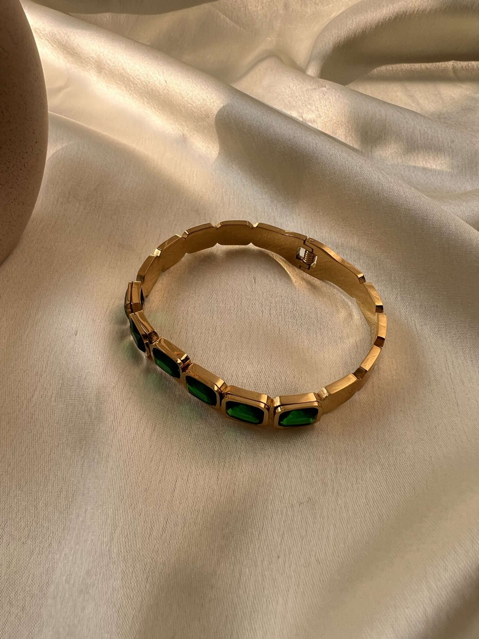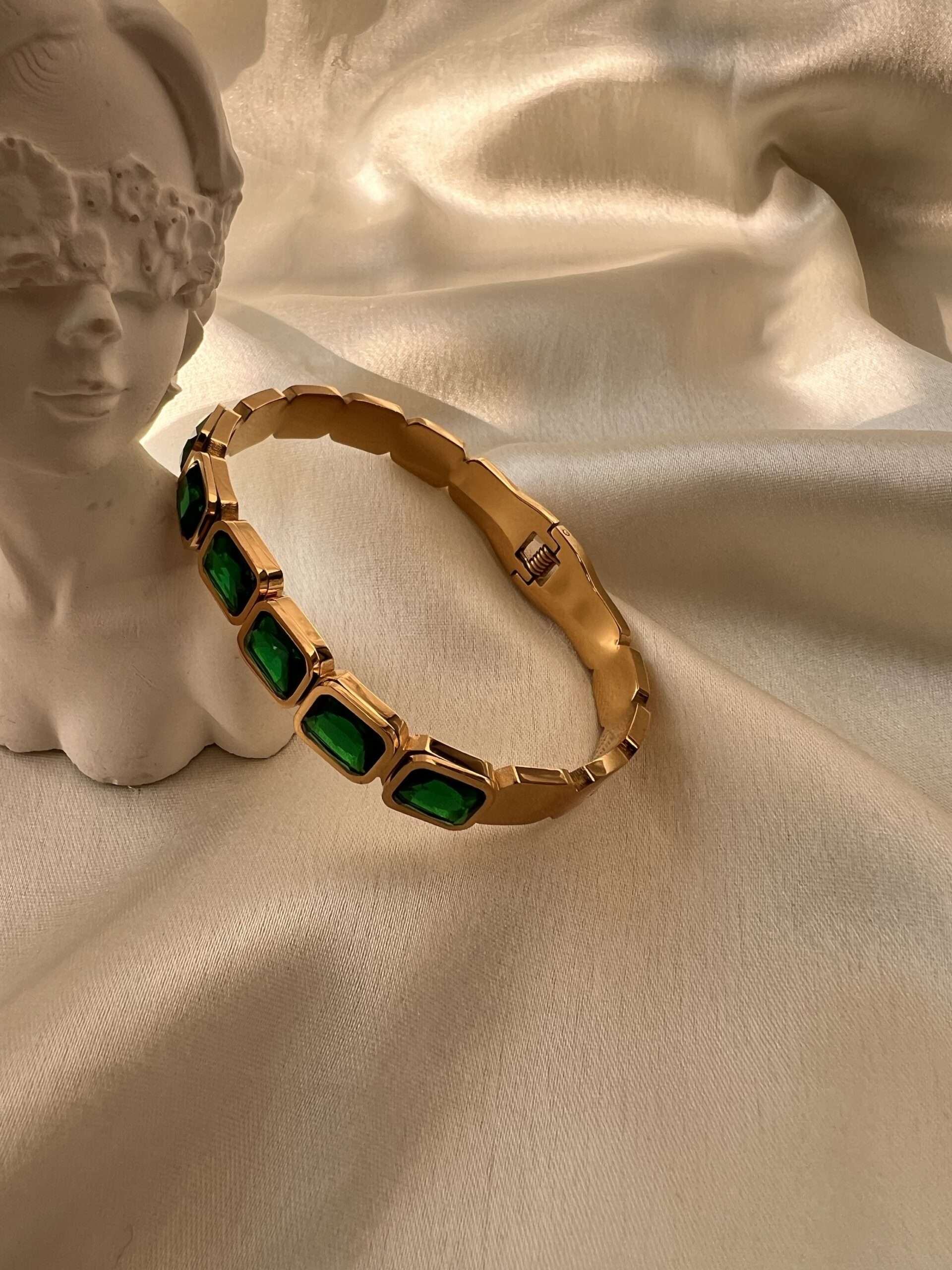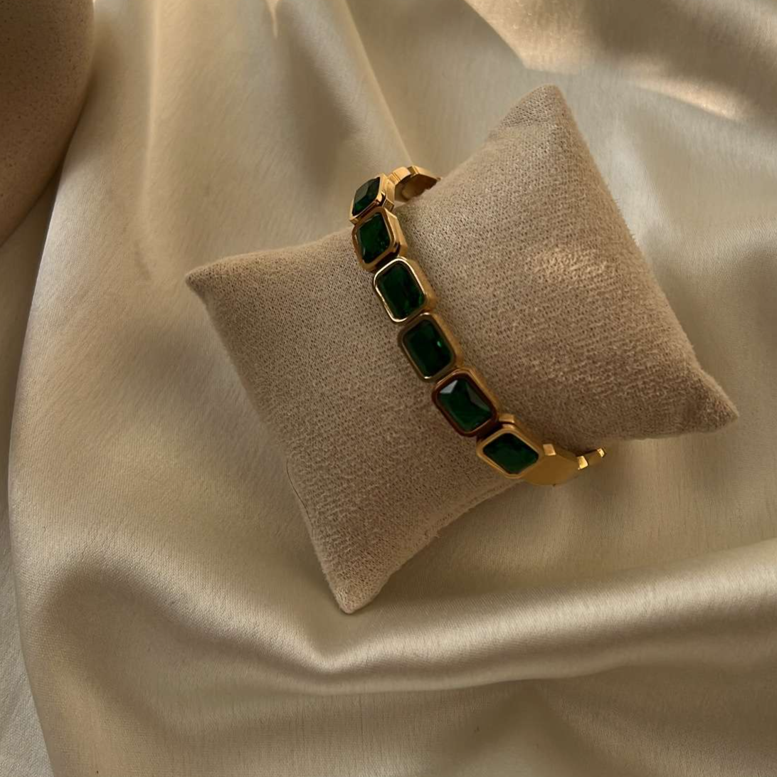 Elevate your style with the elegant simplicity of our Evander emerald bangle. This stunning geometric gold band features vibrant emerald green zirconia stones that are both timeless and eye-catching. Crafted with titanium steel, this universal size bangle is gold plated, anti-tarnish, non-corrosive, and waterproof, ensuring long-lasting wear.