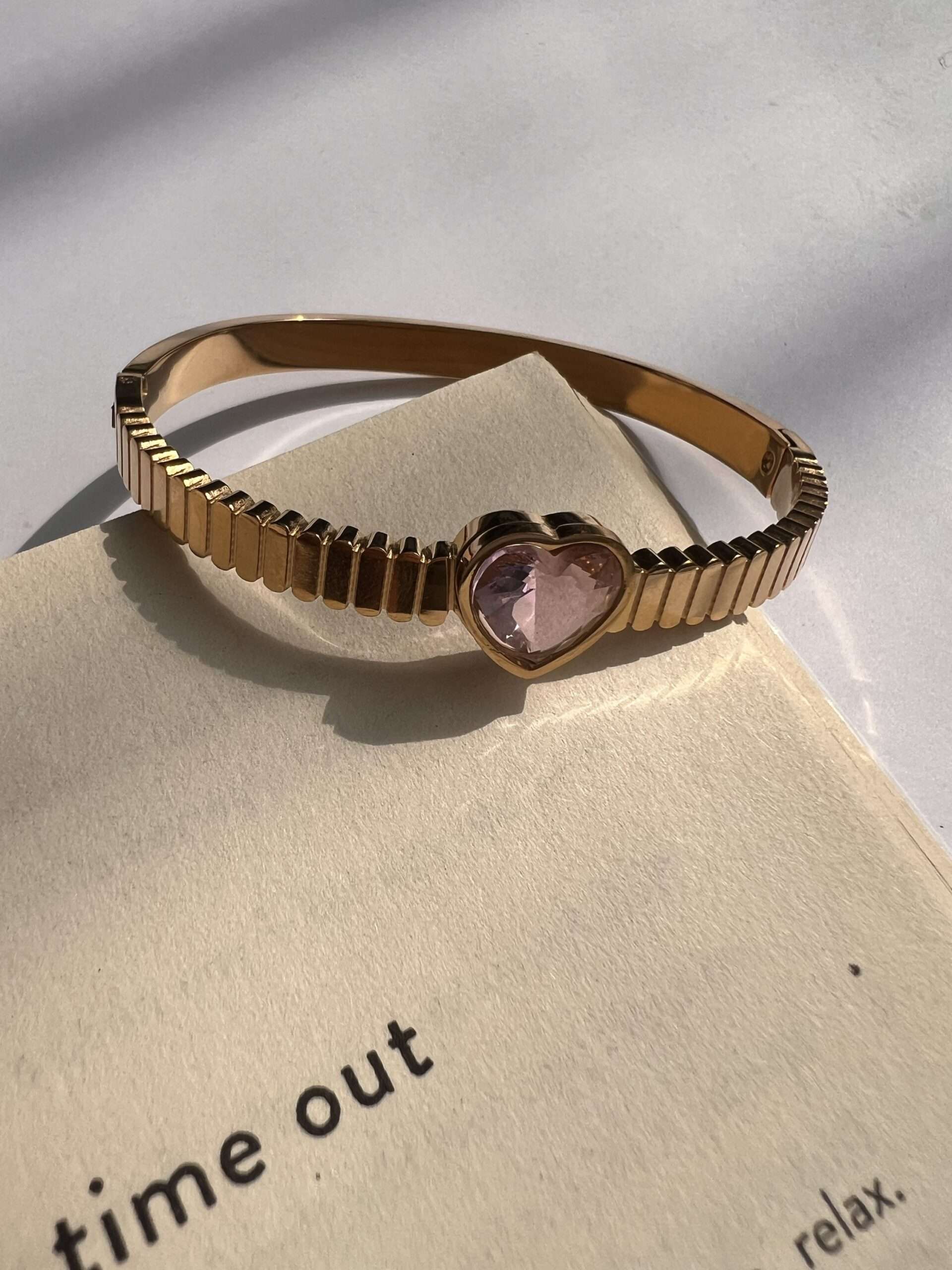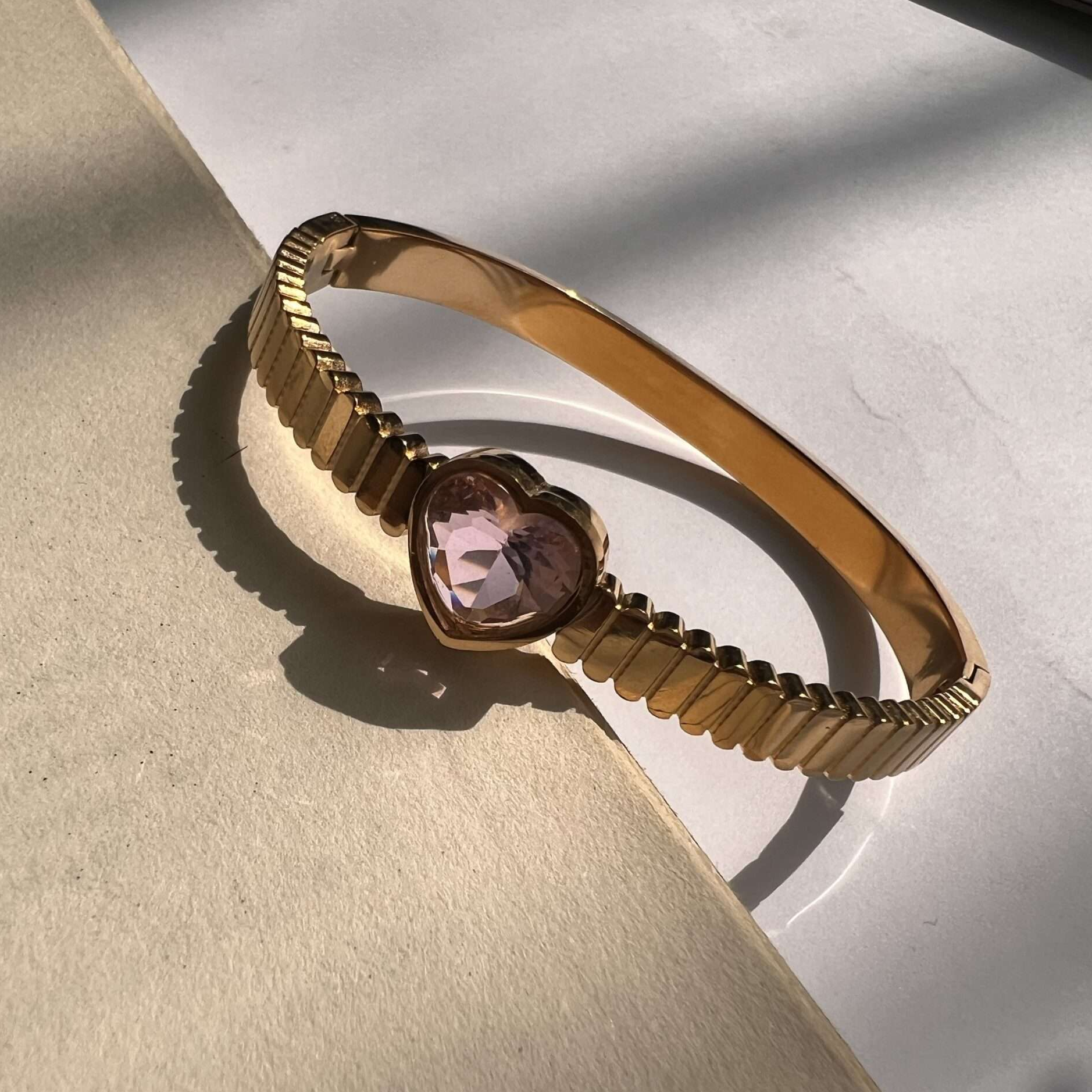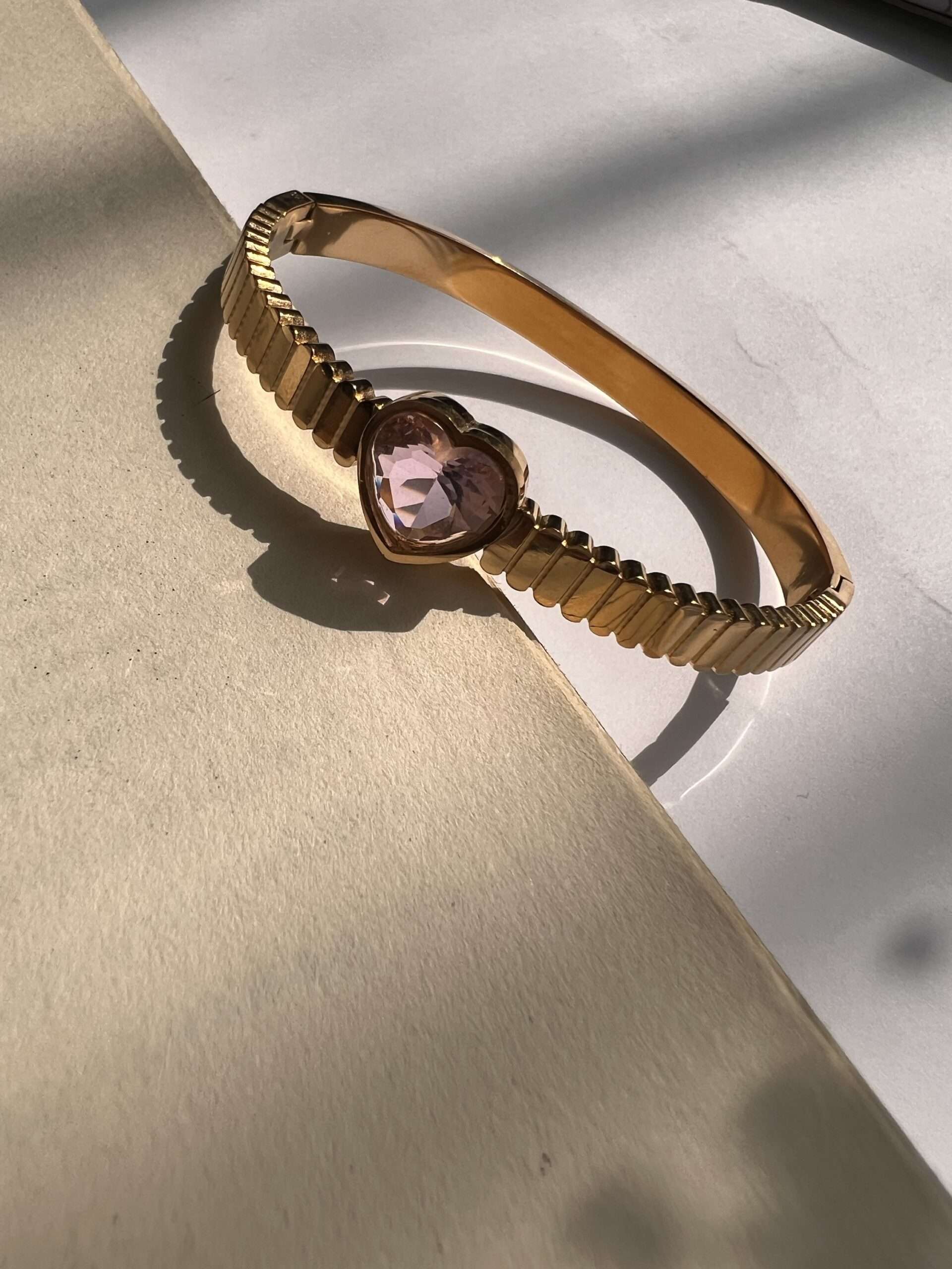 Add a touch of romance to your look with our Fuchia bangle. The pink heart crystal stands out beautifully on the golden textured bangle, while the universal size fits all. The gold plating ensures it won't tarnish or corrode, making it a long-lasting and waterproof accessory. Elevate your style today!