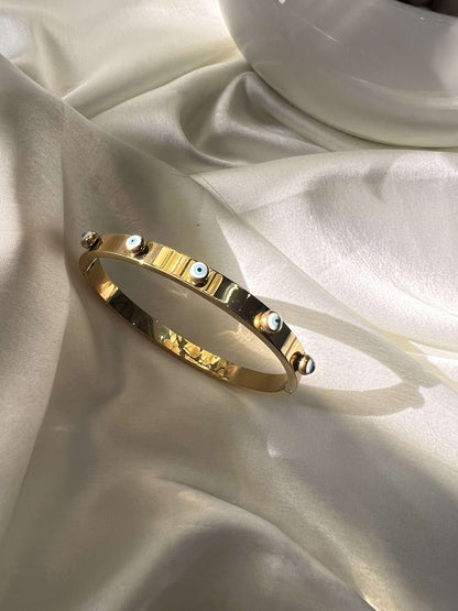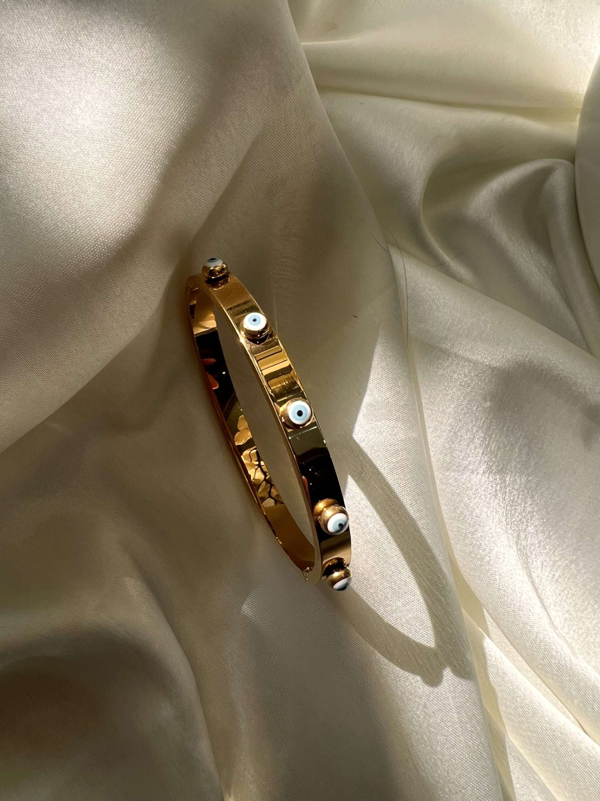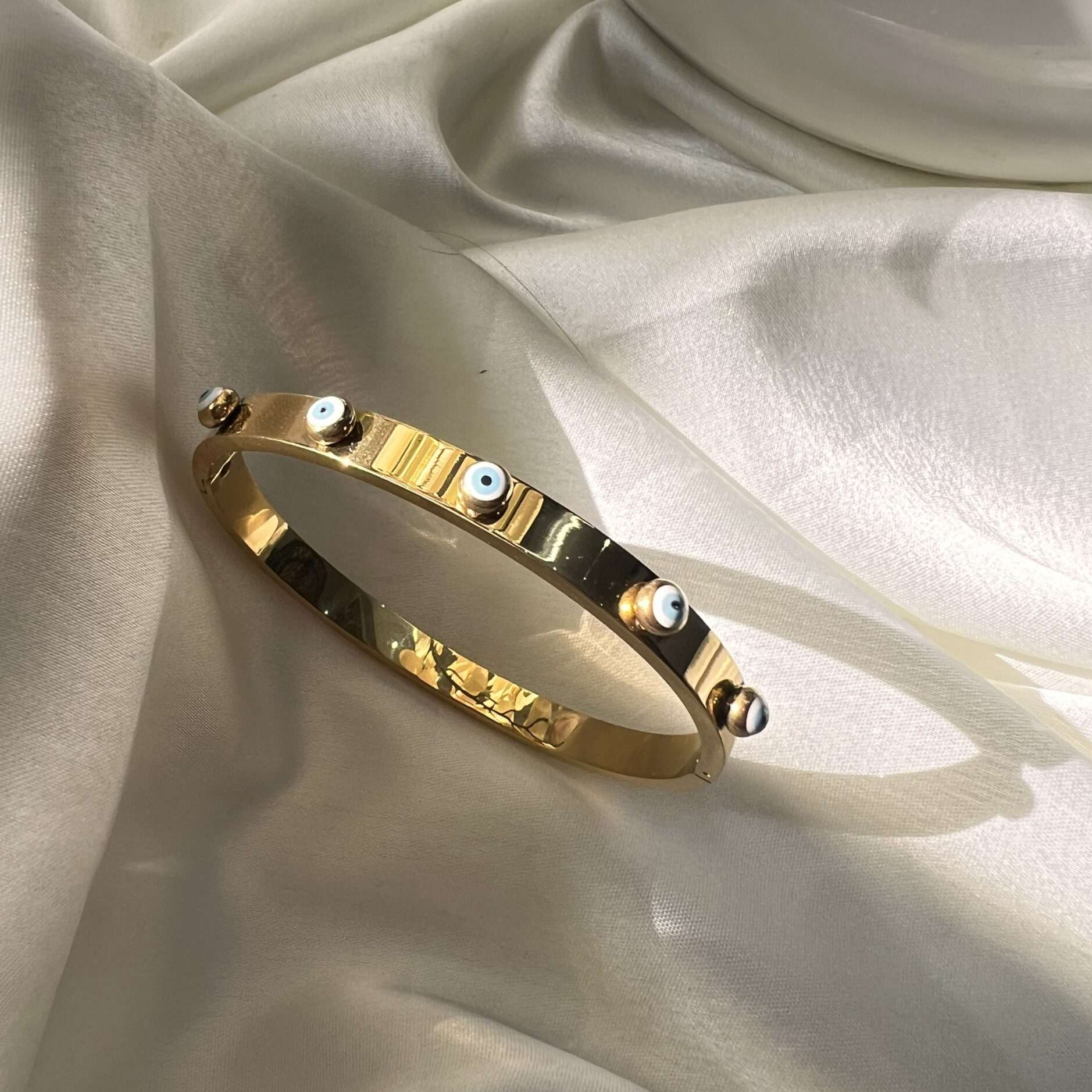 Transform your style with the universal size, openable Hex evil eye bangle in stunning golden stainless steel. Whether worn alone or stacked with your watch, the protruding evil eyes add a touch of boldness and individuality. Elevate your look and make a statement with this must-have accessory.