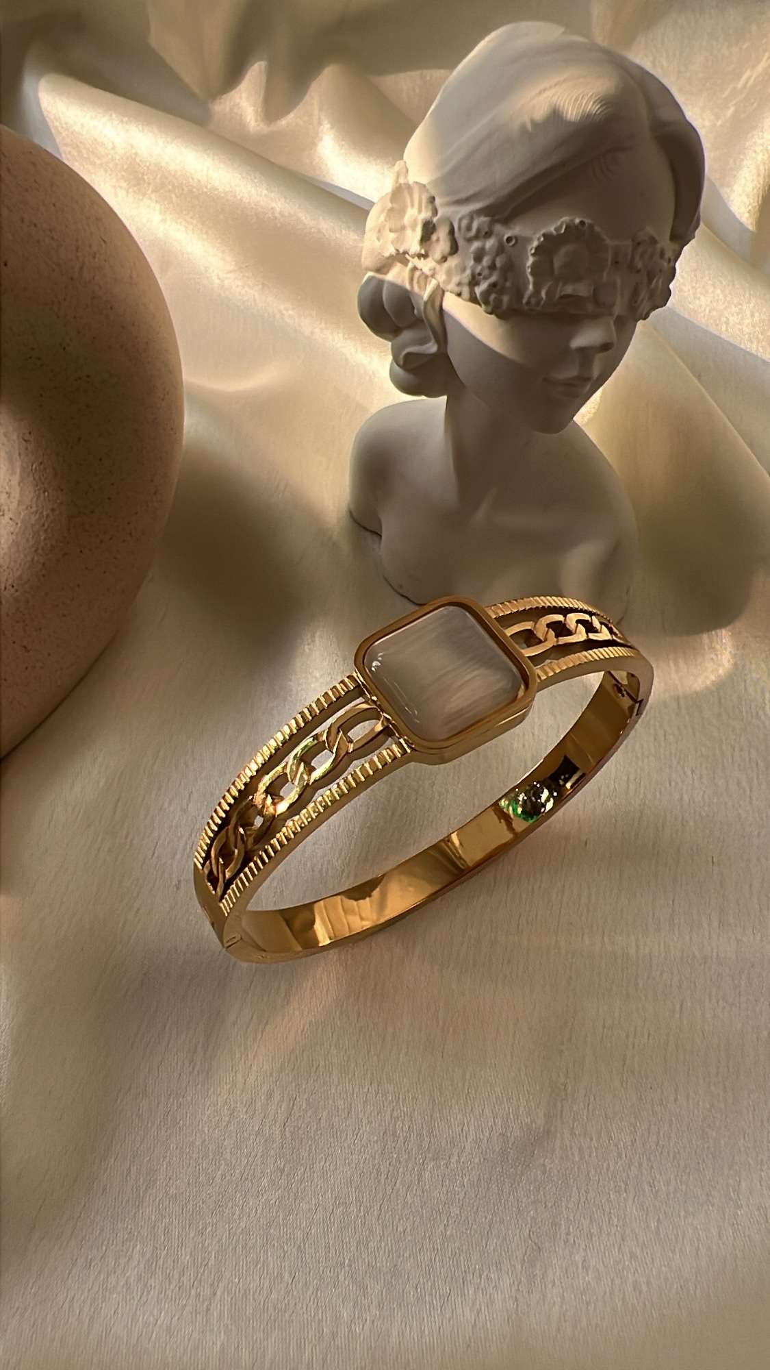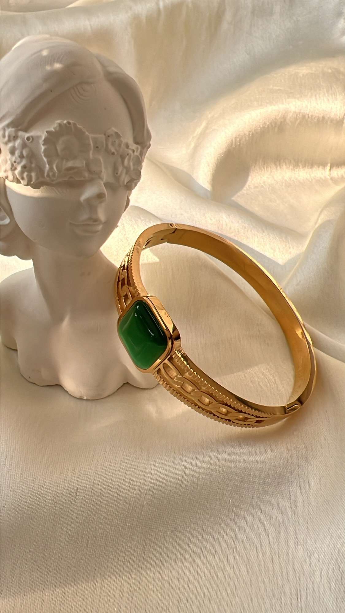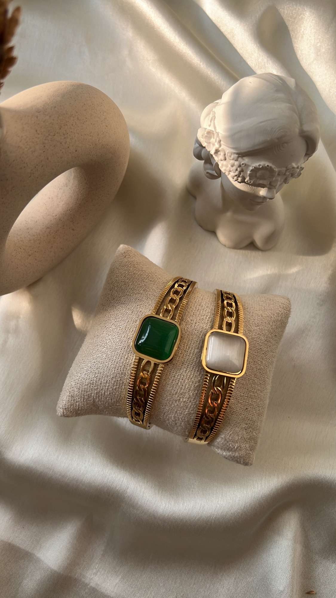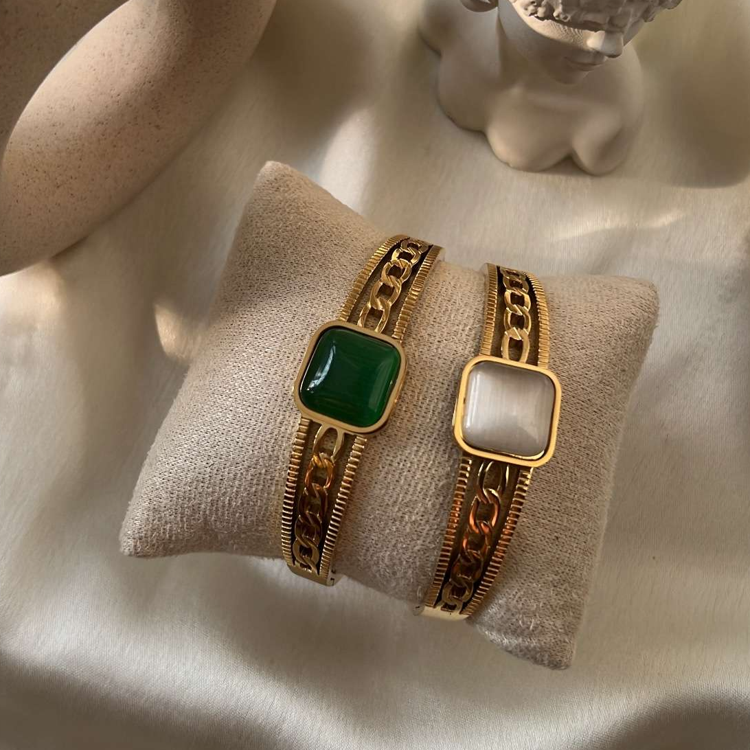 Elevate your style with Leon bangles! These stunning stone bangles in matte white and green are not only beautiful, but also durable and versatile. Made of stainless steel and 18k gold plating, they are openable, universal size, and resistant to tarnishing and corrosion. Perfect for any occasion, these bangles are also waterproof. Upgrade your jewelry collection with the exquisite Leon bangles today!