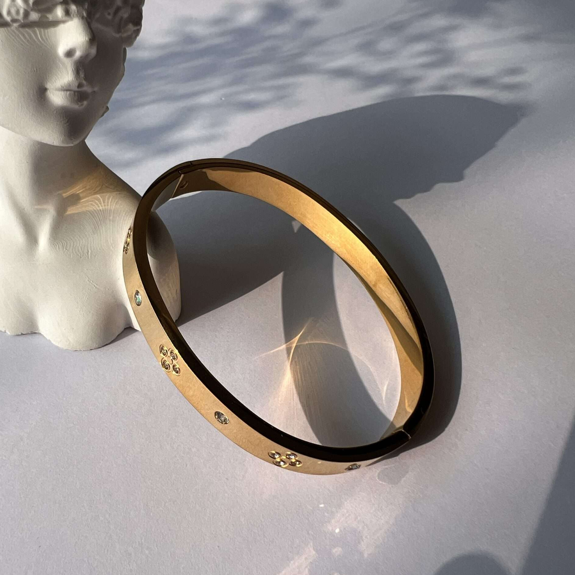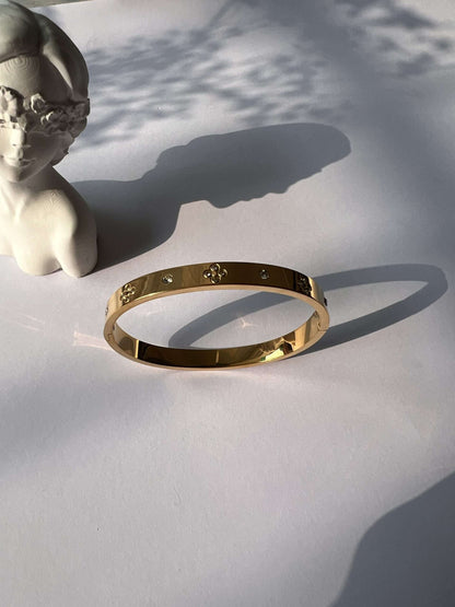 Indulge in the timeless elegance of the Lilla bangle. This openable golden bangle is adorned with stunning stones, adding a touch of sophistication to any outfit. Made with stainless steel and gold plating, it is both anti-tarnish and waterproof, ensuring long-lasting beauty. One size fits all, making it a universal accessory for every occasion. Elevate your style with the Lilla bangle!