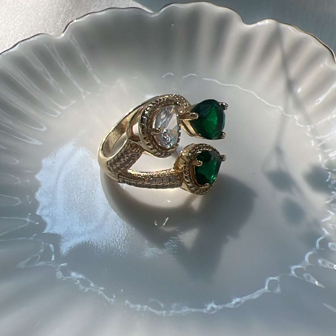 Introducing the Liv cocktail ring - a luxurious 18k gold plated ring with three beautiful water droplet shaped stones in green and golden hues. Its adjustable design and anti-tarnish, non-corrosive, and hypoallergenic properties make it a timeless and versatile addition to any jewelry collection. Stay stylish and worry-free with this waterproof statement piece.