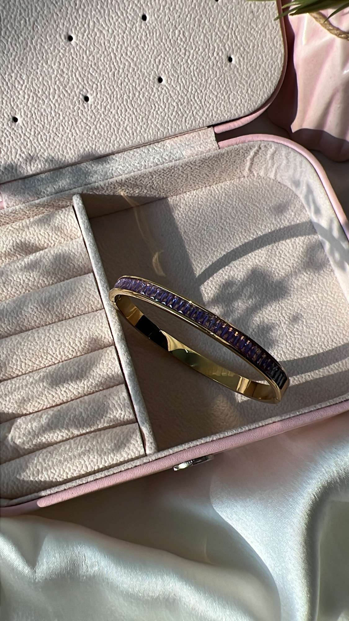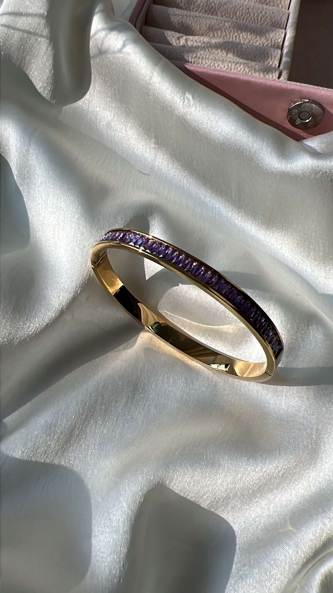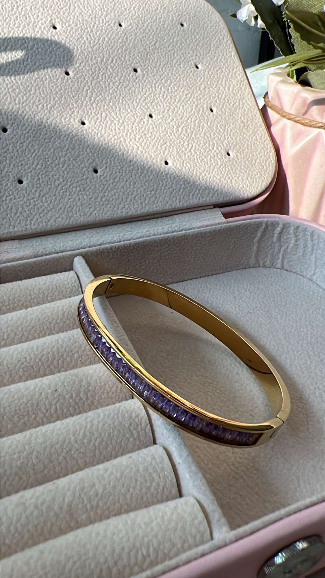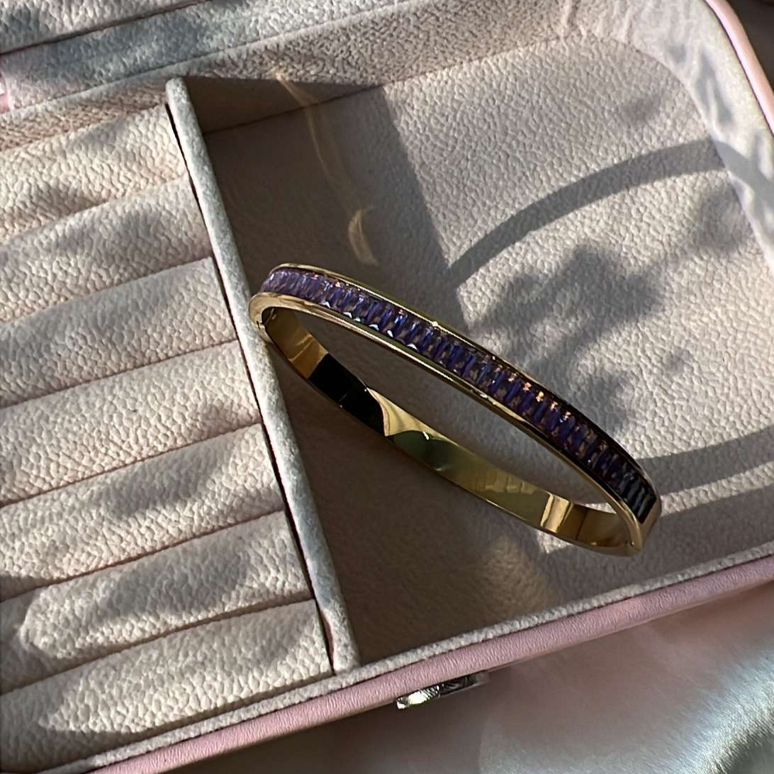 Transform your outfit with the Olva purple tennis bangle! Lilac stones embedded in the golden stainless steel bangle add a touch of elegance while the universal size and openable design make it easy to wear. Elevate your style by wearing it alone or stacking it with your favorite bracelets.