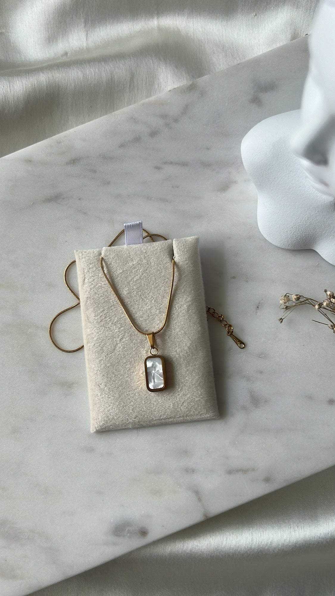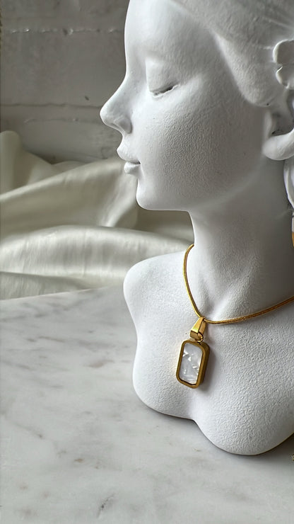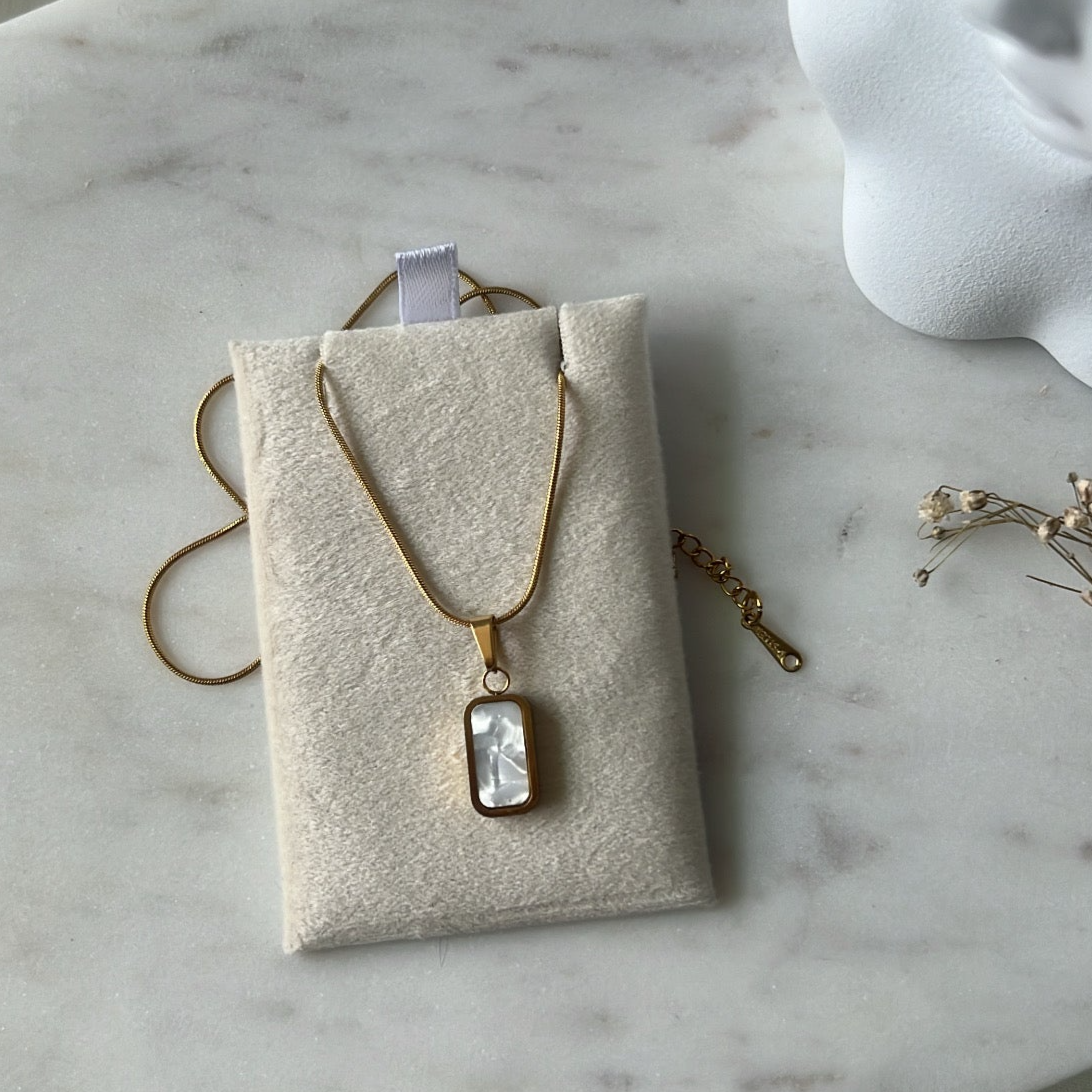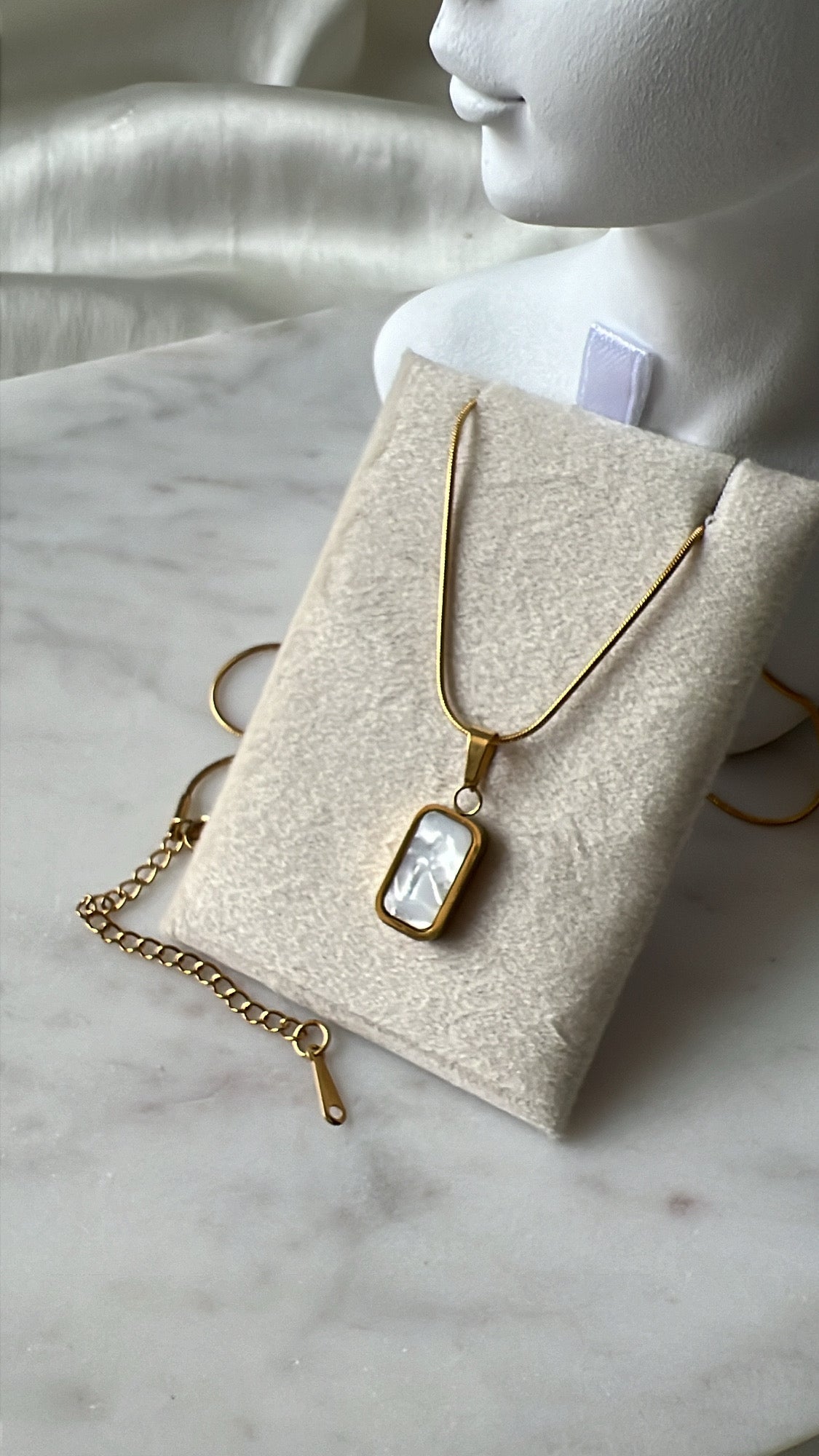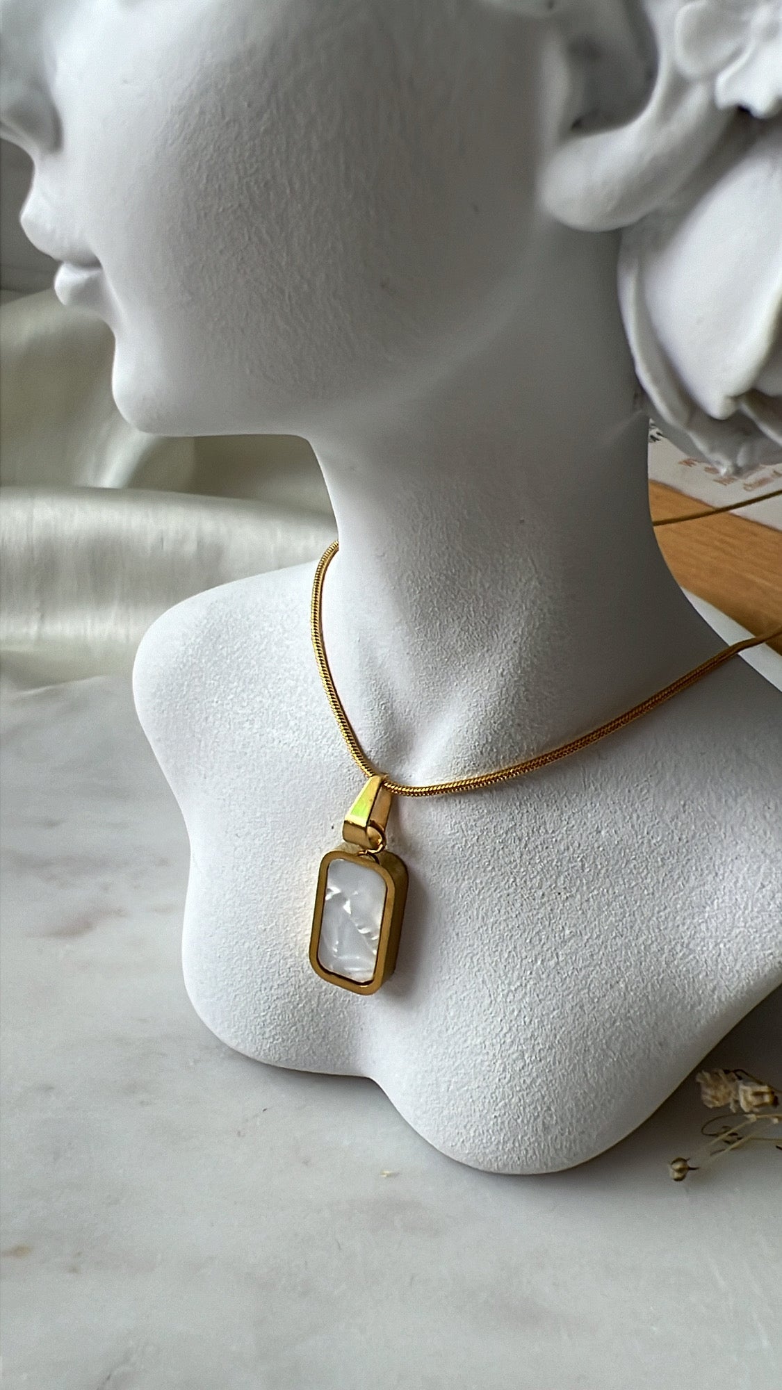 Experience luxury with our Ria marble pendant. The minimal rectangular white pendant is made from stainless steel and paired with a gold plated, anti-tarnish chain. Waterproof and adjustable up to 16 inches, this pendant is both functional and stylish. Elevate your look with this versatile piece.