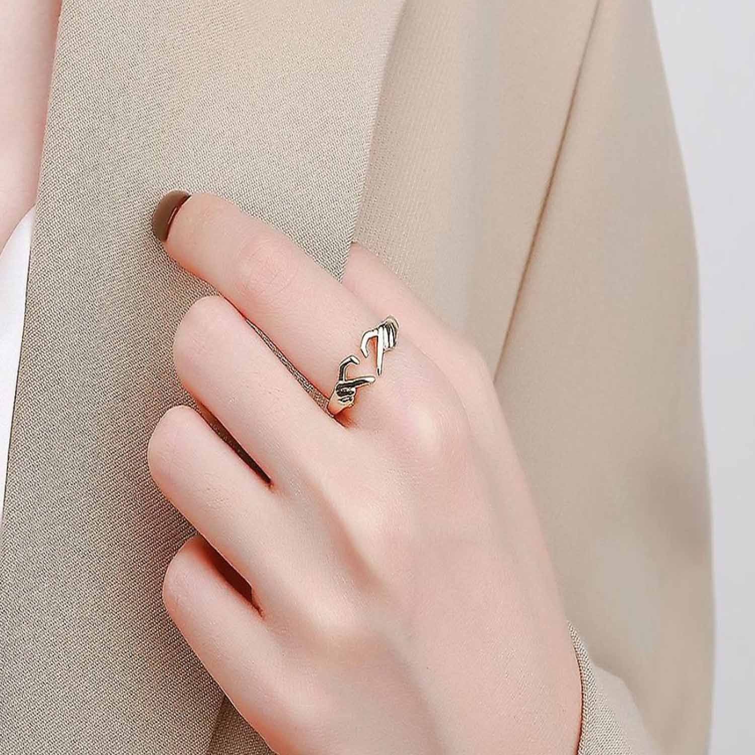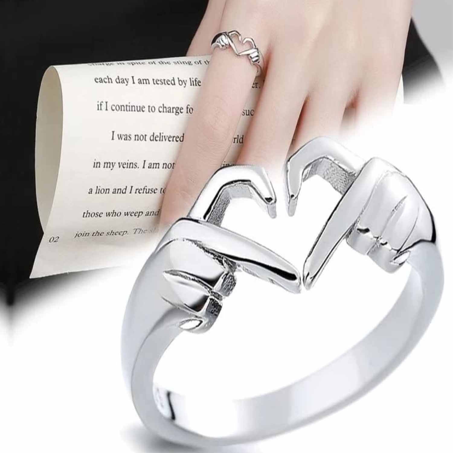 Introducing the "Eternal Embrace" - a symbolic masterpiece featuring the Silver Geometric Palm Love Gesture Couple Hands than Heart Finger Thumb Ring, presented in a singular, carefully crafted package.