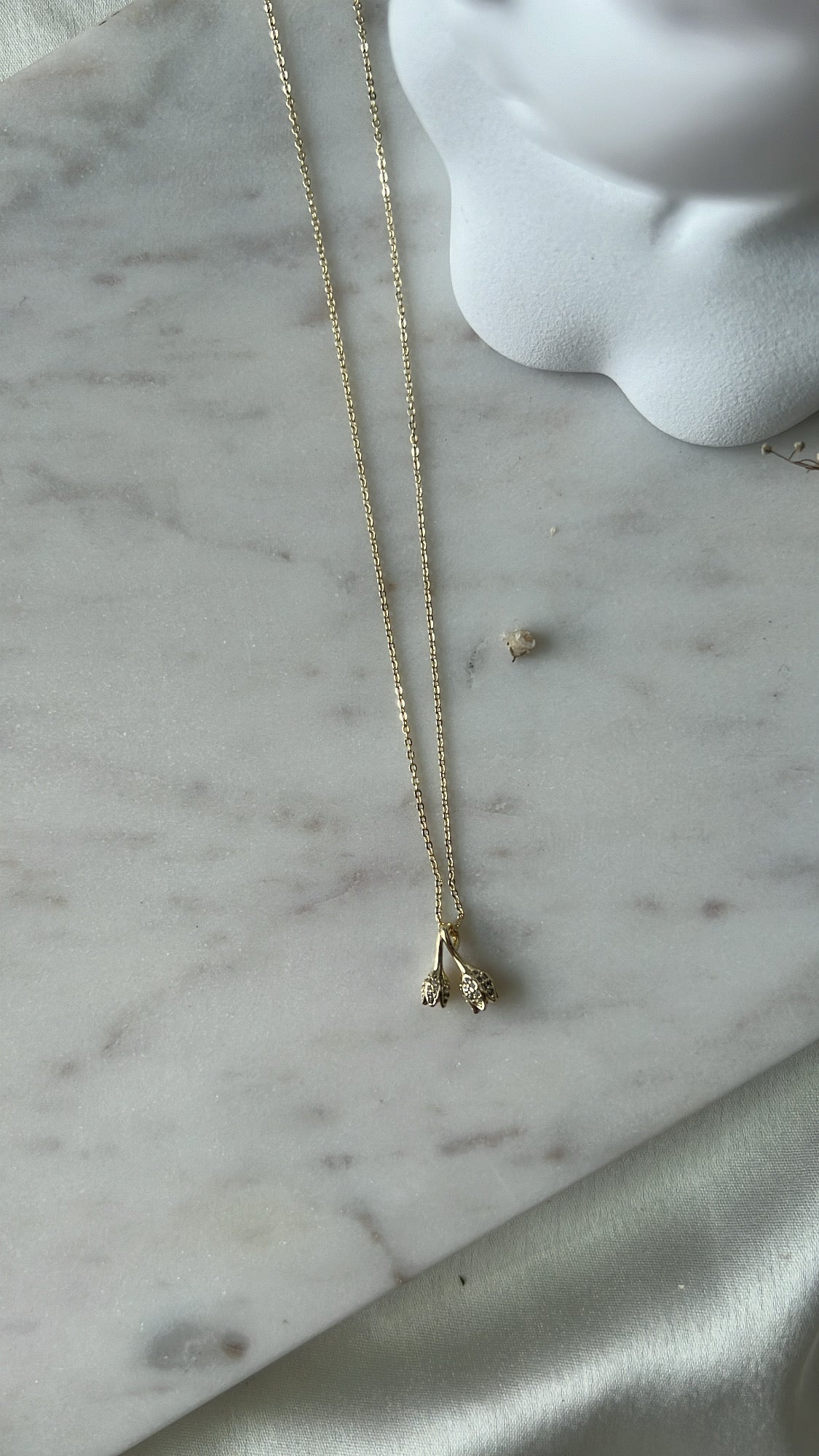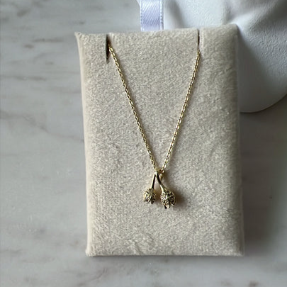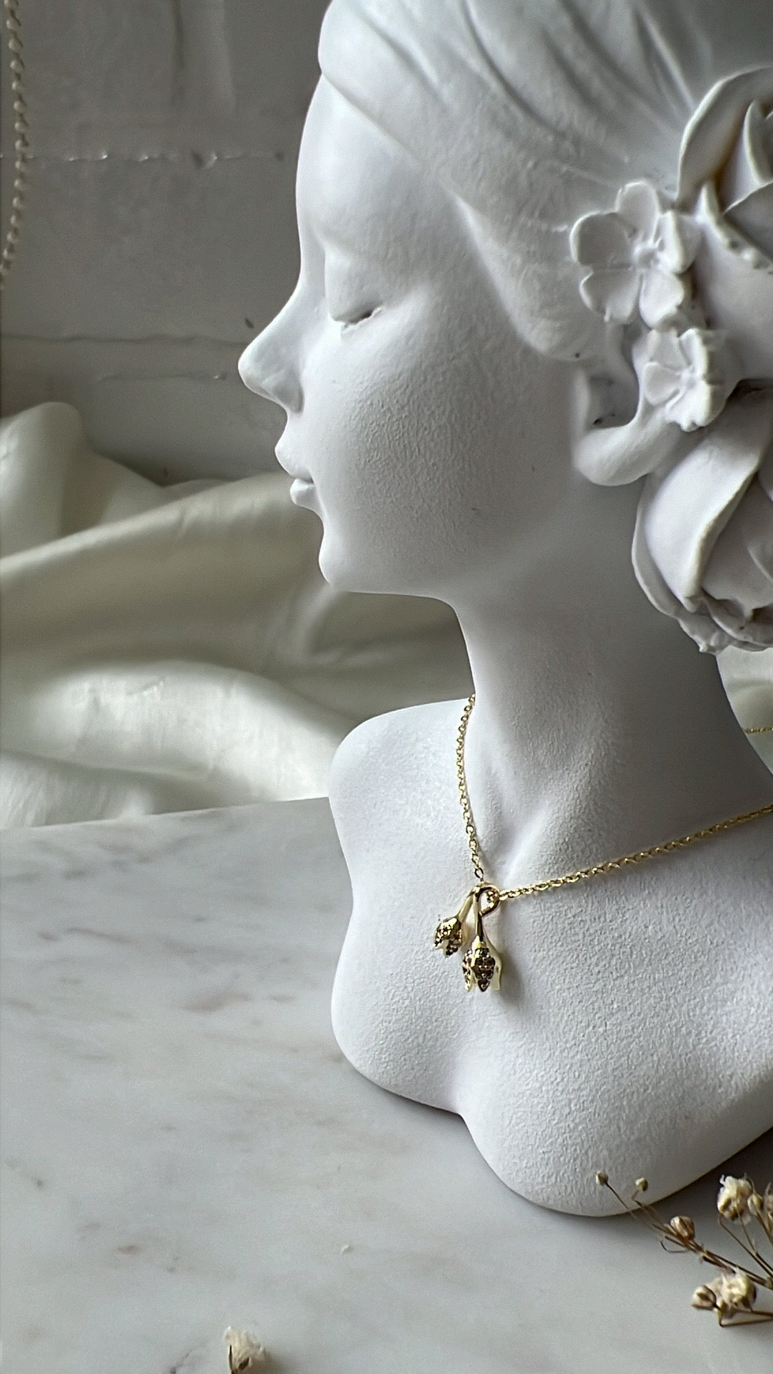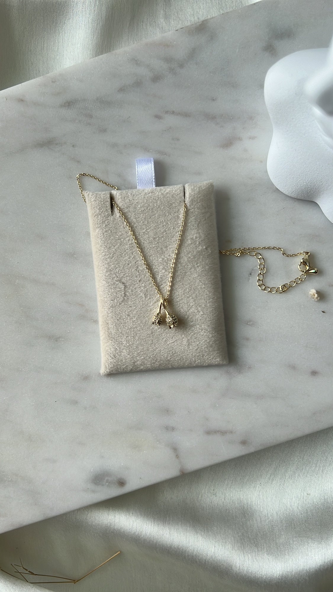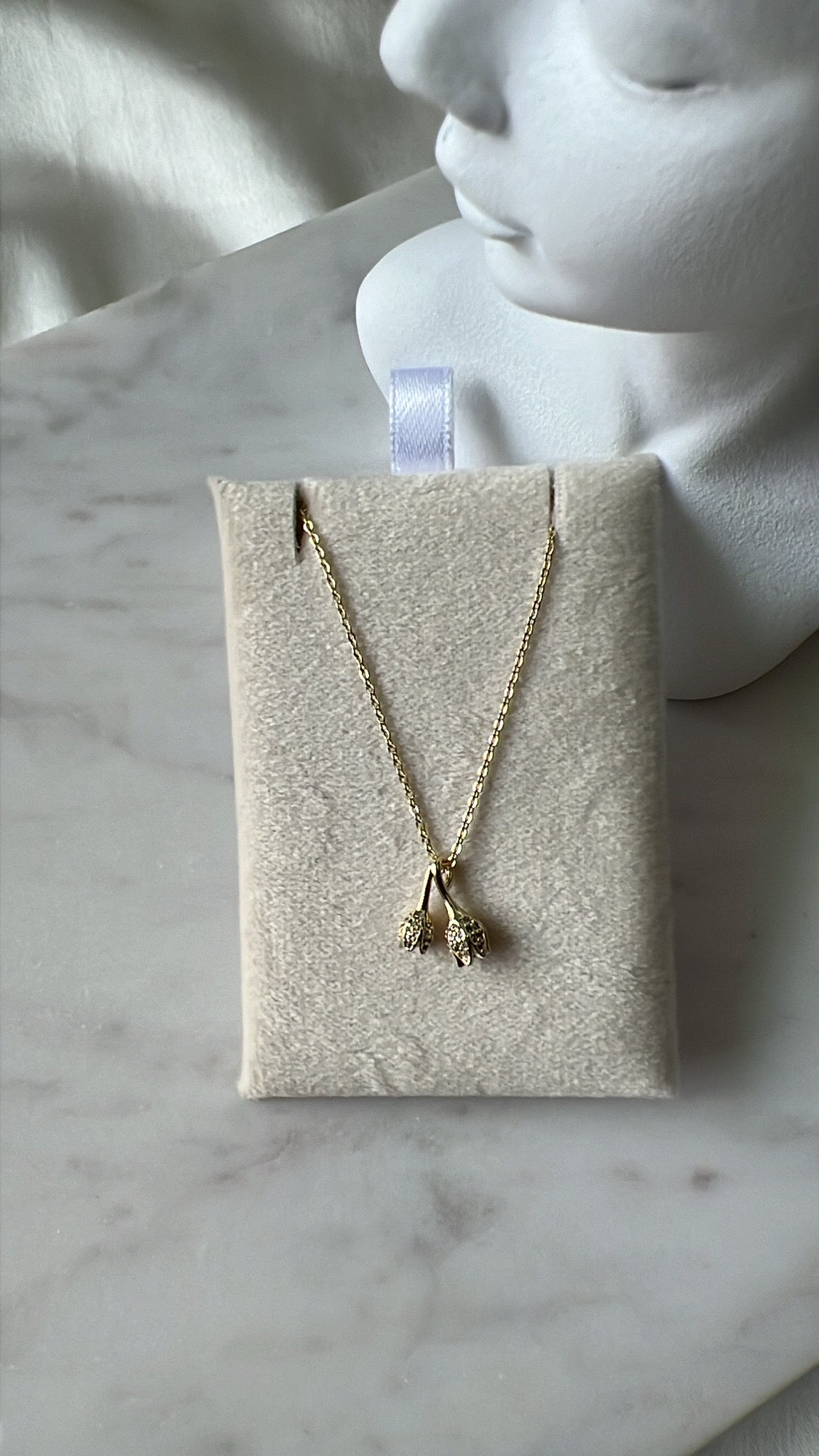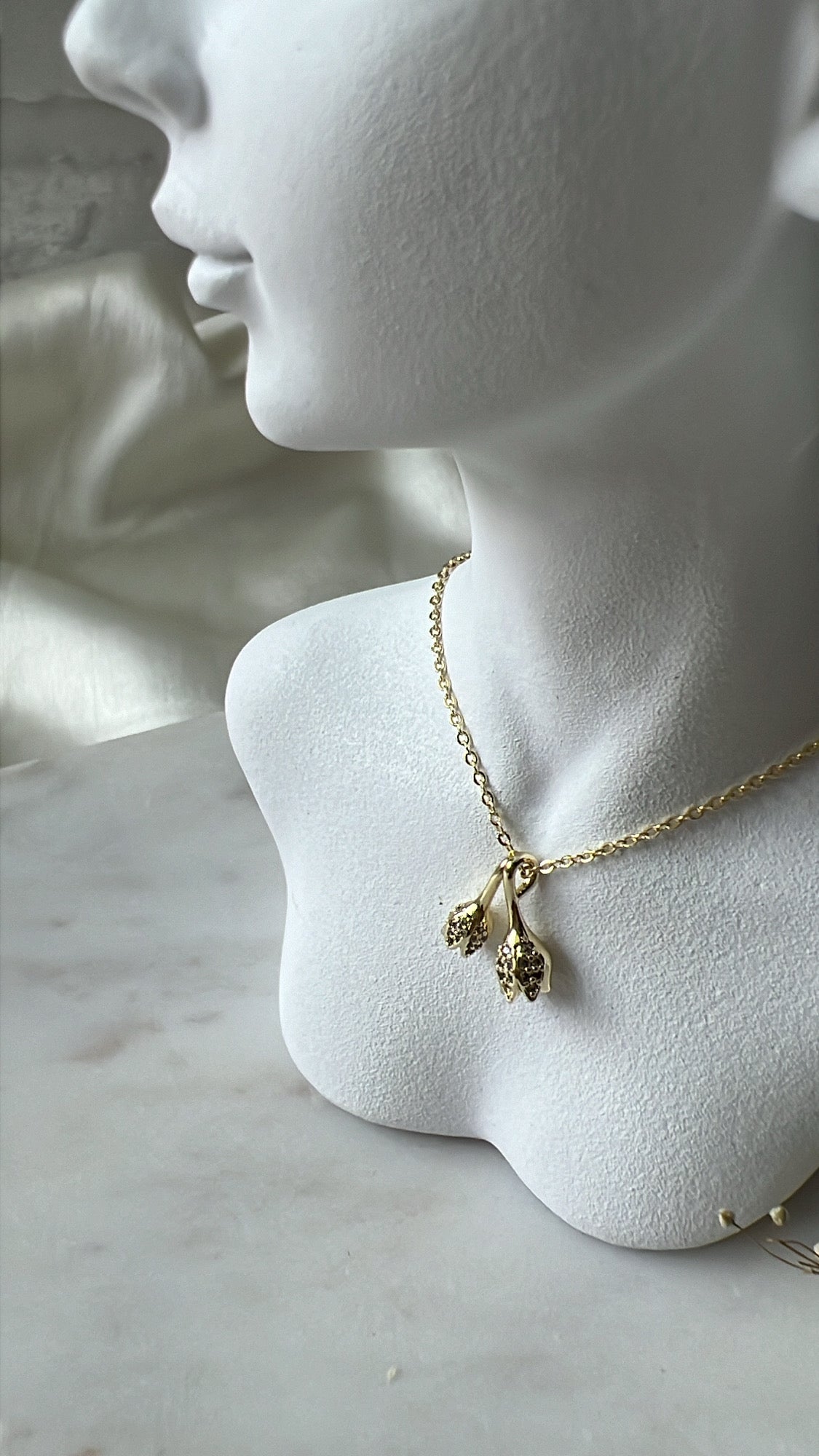 This stunning tulip neckpiece features twin tulip flowers adorned with minimal stone detailing. Made with anti-tarnish, non-corrosive gold plated stainless steel, the necklace is both waterproof and adjustable in length (16 inches with extensions). A stylish and durable addition to any jewelry collection!