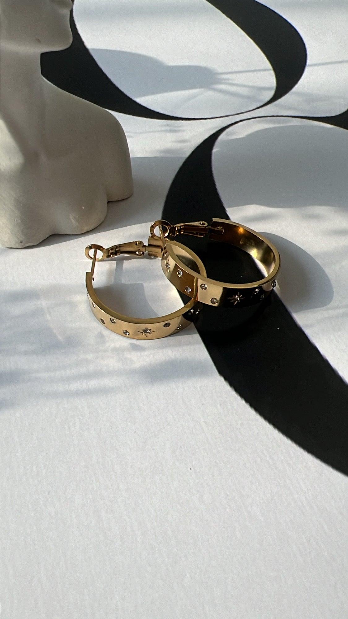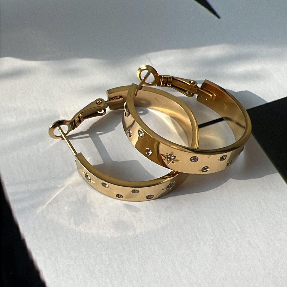 Add a touch of sparkle to your look with our Twinkling hoops! These gold plated hoops feature zircon embellishments and are anti-tarnish, non-corrosive, and waterproof, ensuring long-lasting shine. Elevate any outfit with these dazzling and durable earrings. Order now and make a statement!