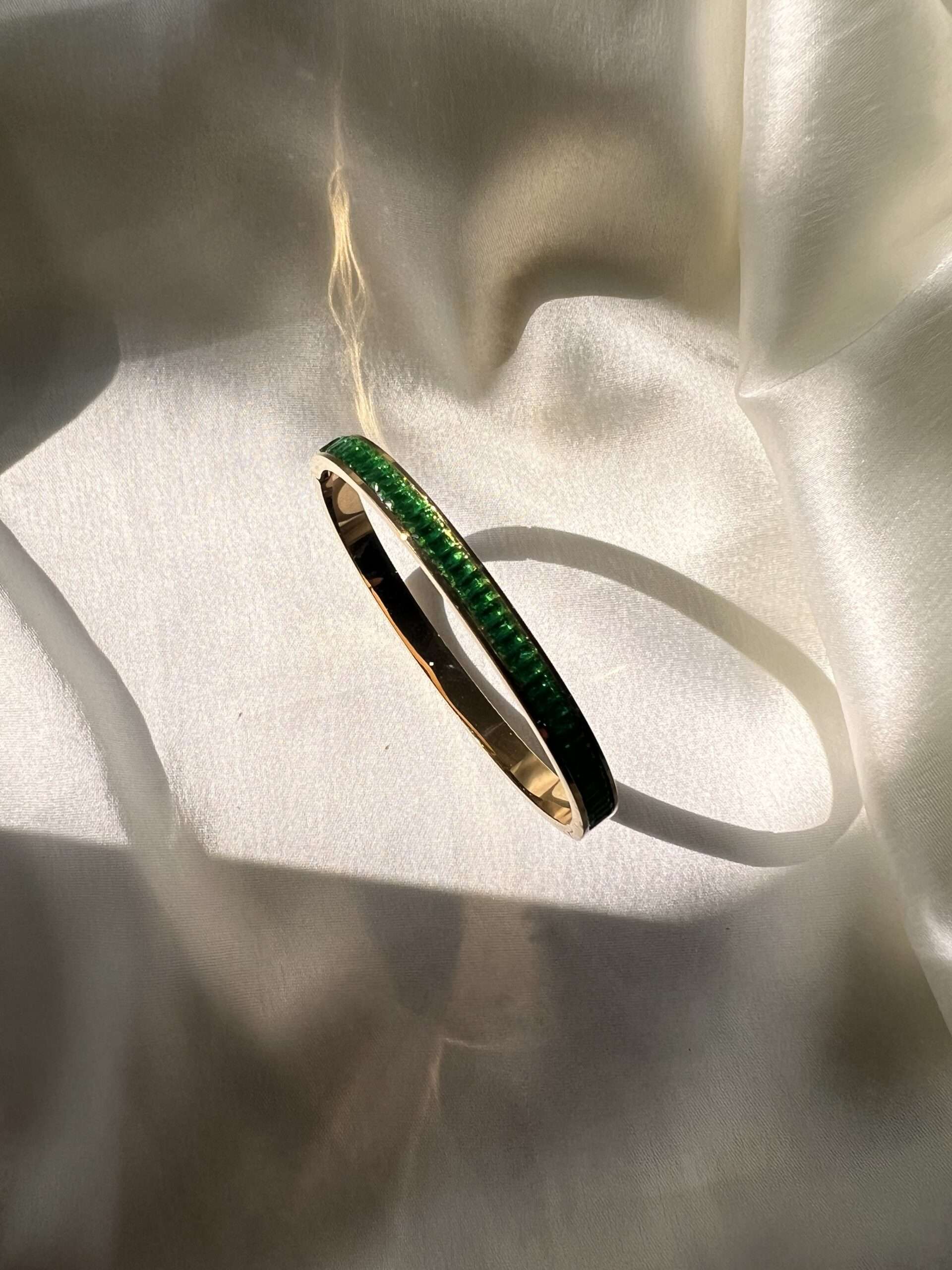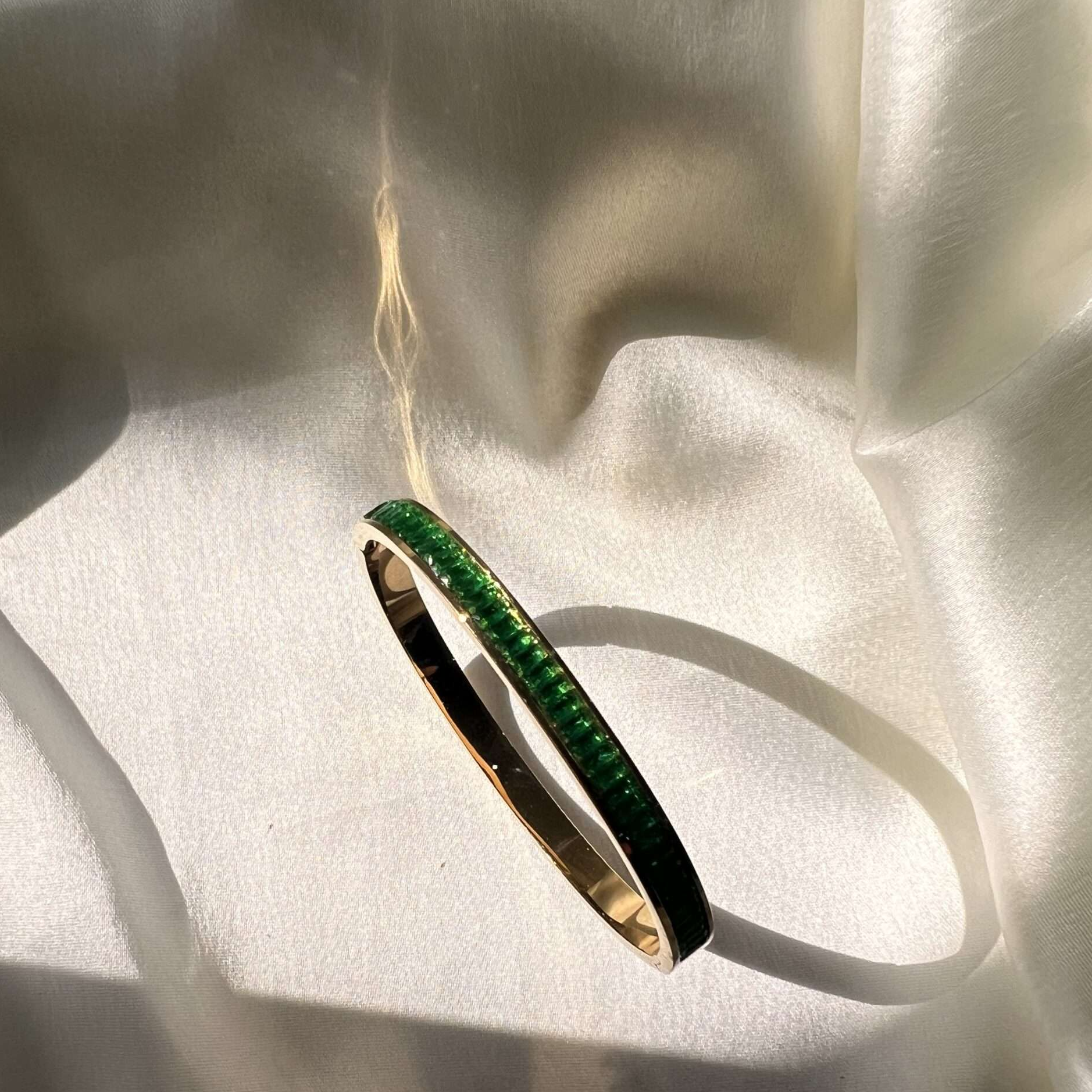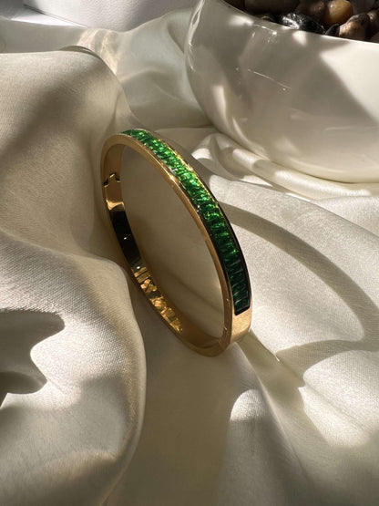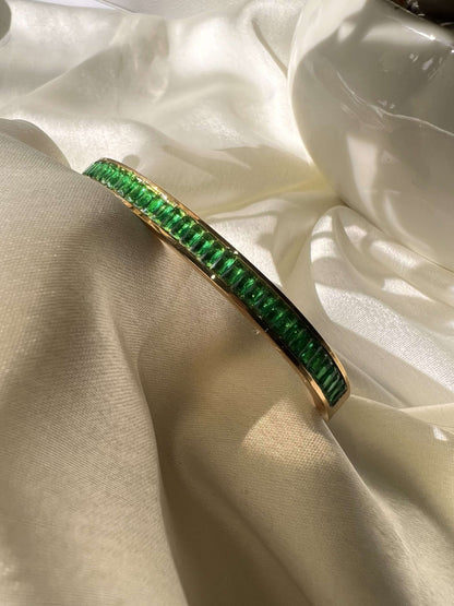Emerald green stones embedded in the golden stainless steel bangle is universal size and openable. Wear it alone or stack with your watch to create your own styleEmerald green stones embedded in the golden stainless steel bangle is universal size and openable. Wear it alone or stack with your watch to create your own style
